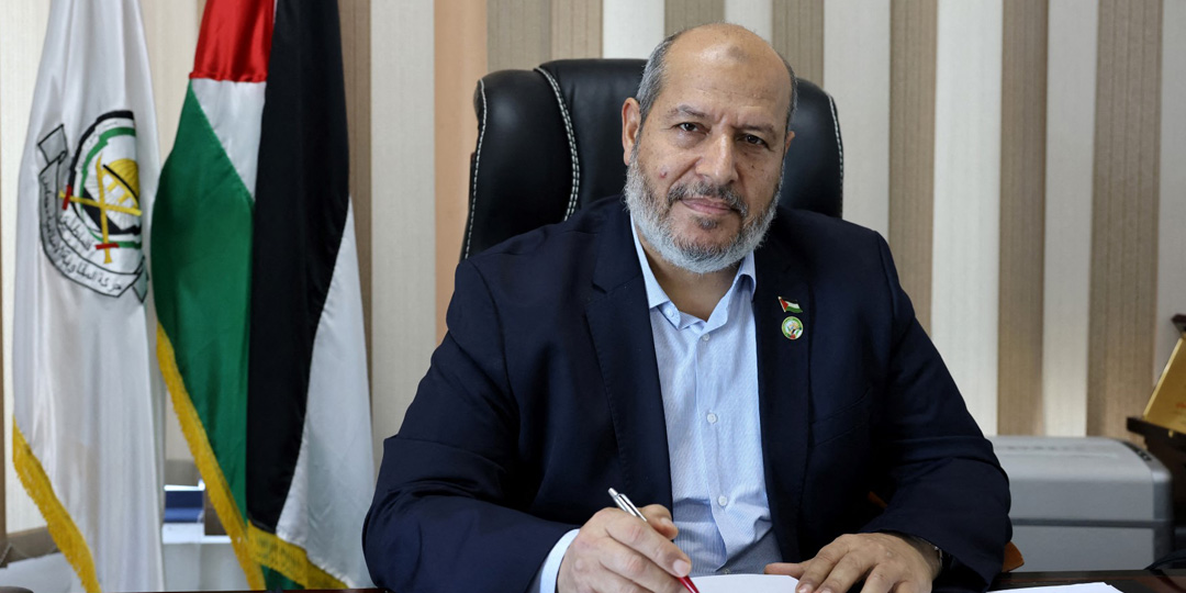 Khalil al-Hayya, senior leader and top Hamas legislative candidate, smiles during an interview with AFP at his office in Gaza City on April 21, 2021. Postponing elections "even for a single day" will push Palestinians "into the unknown", al-Hayya warned in an interview ahead of a long-awaited vote that is clouded with uncertainty. On May 22, Palestinians from the occupied West Bank, the Gaza Strip and east Jerusalem are scheduled to vote for the first time since 2006. (Photo by Emmanuel DUNAND / AFP)