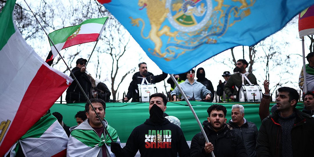 Anti-Iranian regime protesters stand with the Imperial Standard of the Shahanshah of Iran flag (top) during a gathering outside the Iranian Embassy, central London, on January 12, 2026. (Photo by HENRY NICHOLLS / AFP)