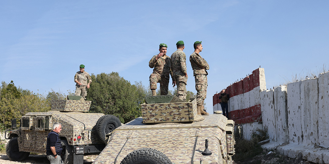 This photograph taken during a press tour organised by the Lebanese army shows Lebanese soldiers standing atop military vehicles in Alma Al-Shaab, near the border with Israel in southern Lebanon, on November 28, 2025. It was the first guided tour the army gave journalists since a November 2024 ceasefire sought to end over a year of hostilities between Hezbollah and Israel.