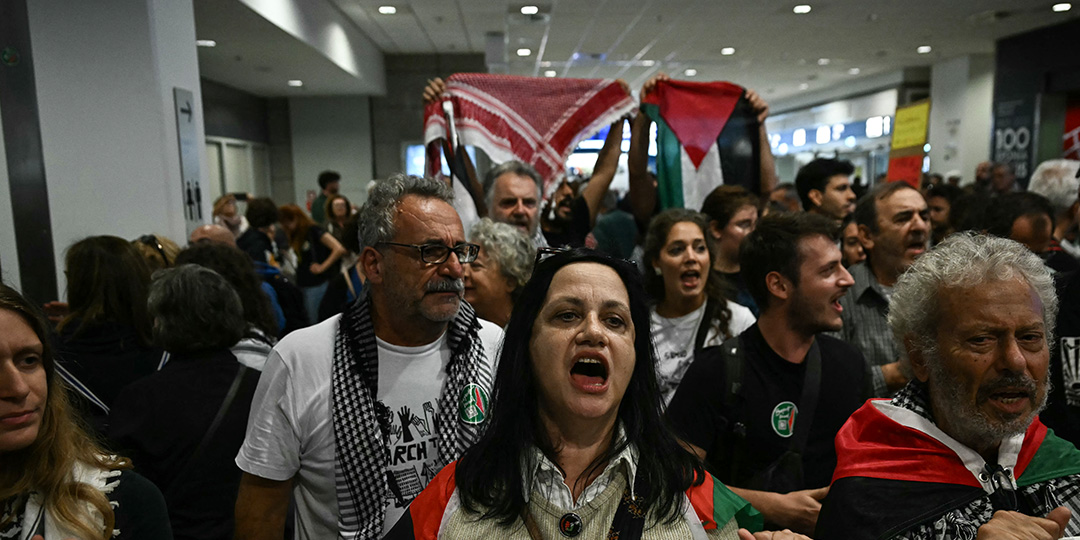 A crowd hold banners in support of the Global Sumud Flotilla at the arrivals area of Athens International Airport on October 6, 2025, as they await the return of activists who were sailing aboard vessels from the Gaza-bound aid flotilla, after Israel stopped the flotilla and detained hundreds of people. The Italian and Greek foreign ministries said their released nationals would fly on October 6, 2025, from Israel to Athens. Italian Foreign Minister Antonio Tajani said on X that the 15 Italians would have assistance for a subsequent transfer to Italy. (Photo by Aris MESSINIS / AFP)
