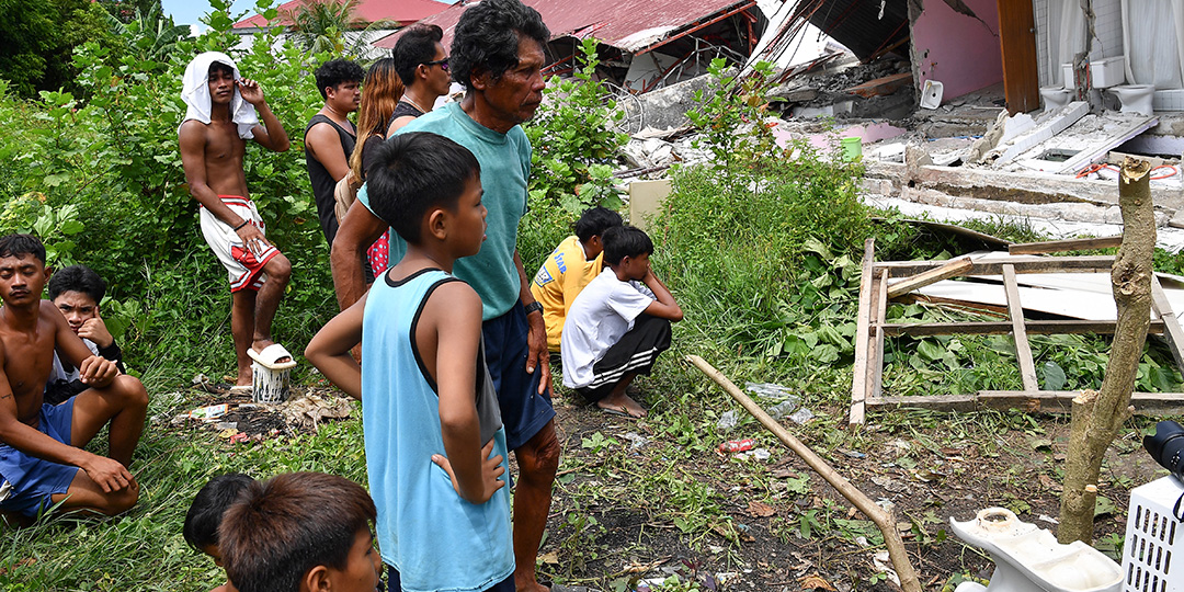 People inspect a collapsed building where three people were reported missing in Bogo City on October 1, 2025, after a powerful 6.9 magnitude earthquake jolted the central Philippines, killing dozens on the island of Cebu with fears the toll could rise. The death toll from a powerful earthquake in the central Philippines rose above 50 on October 1, with injured patients overwhelming hospitals on the island of Cebu. (Photo by TED ALJIBE / AFP)