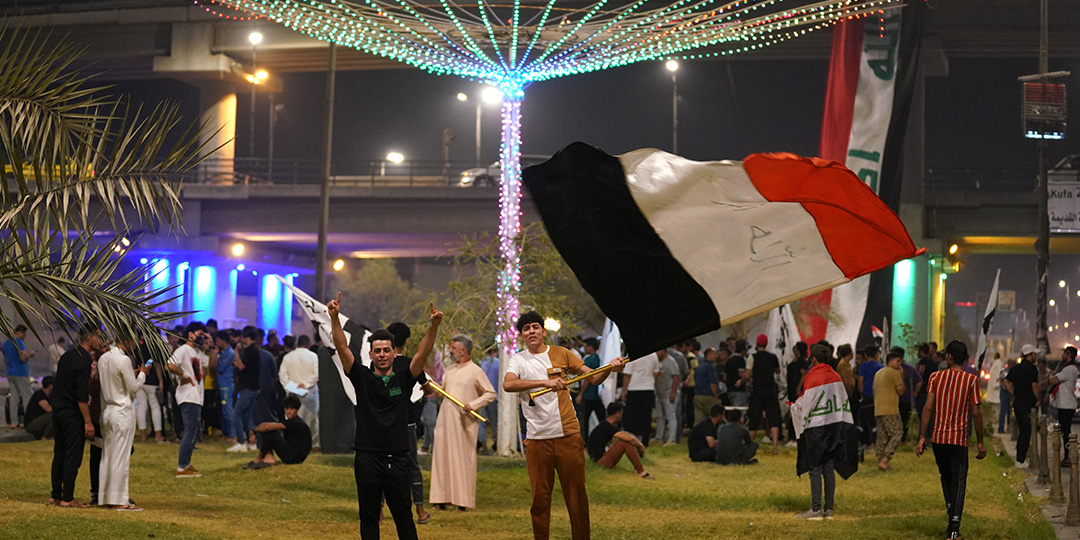 Iraqi anti-government demonstrators lift a national flag during a rally calling upon their compatriots to take part in protests the following day, in the central Iraqi city of Najaf, on September 30, 2022. (Photo by Qassem al-KAABI / AFP)