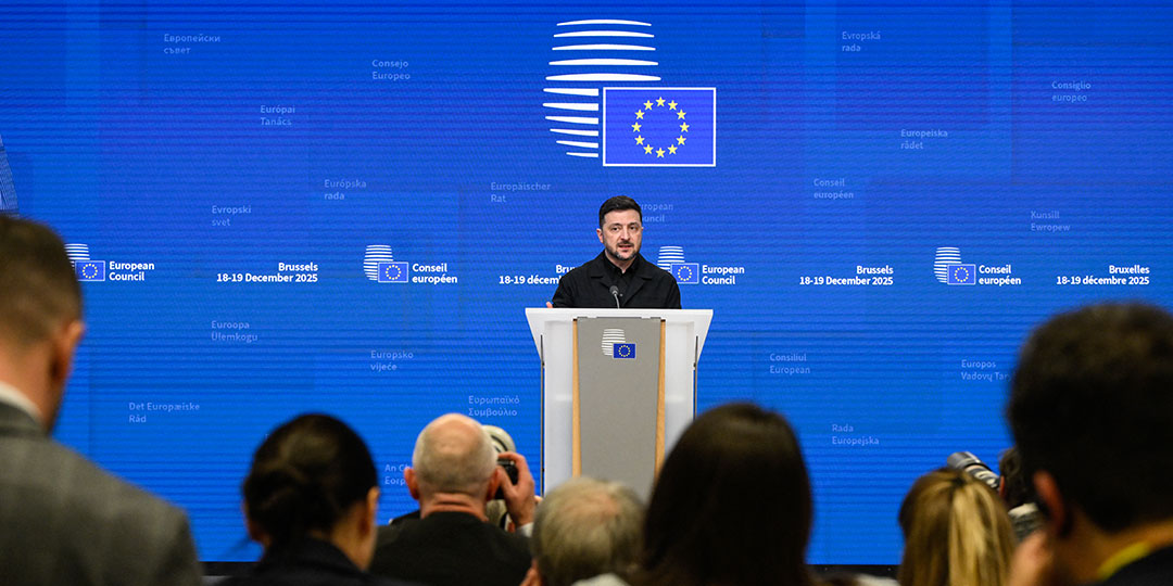 Ukraine's President Volodymyr Zelensky speaks during a press conference as part of the European Council meeting in Brussels on December 18, 2025. European Unions leaders meet in Brussels on December 18 and 19, 2025, to discuss in particular the need to support Ukraine, transatlantic relations and the EU's strategic autonomy.