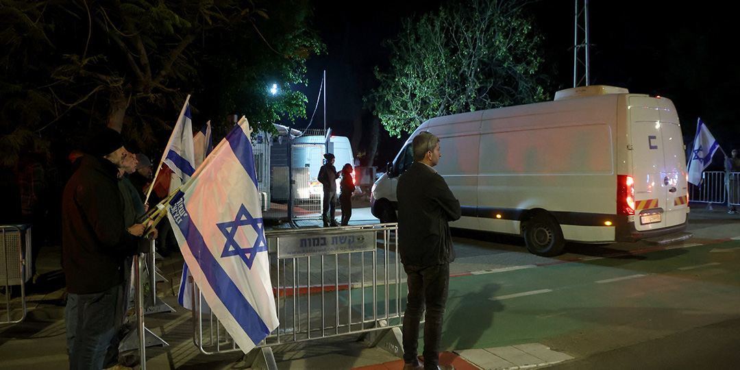 Israelis wave the national flag as they watch the convoy of vehicles transporting the bodies of the four Israeli hostages handed over by Hamas, enter the National Center of Forensic Medicine in Tel Aviv on February 27, 2025. The bodies of four Israeli hostages were handed over by Hamas early on February 27, authorities confirmed, followed soon after by the return of another group of freed Palestinian prisoners to the occupied West Bank. (Photo by GIL COHEN-MAGEN / AFP)