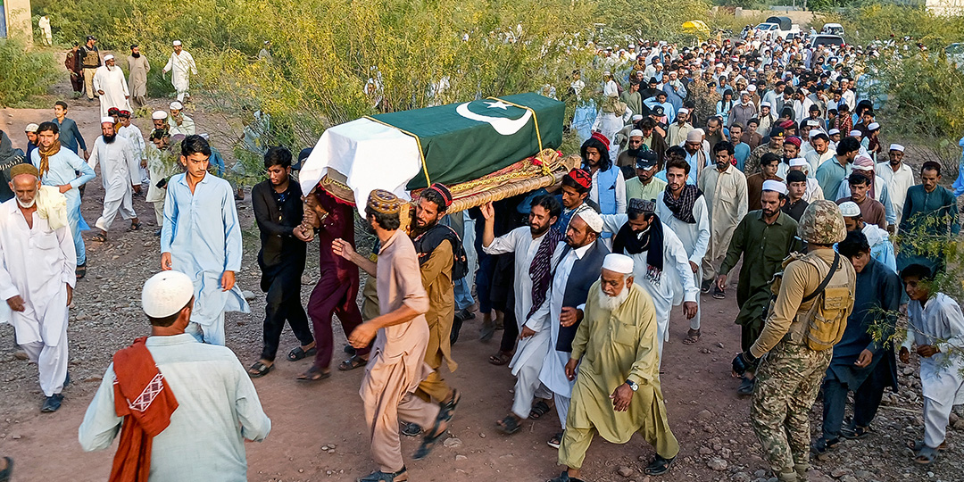 Mourners and villagers carry the coffin of a paramilitary soldier, who was killed in cross-border clashes between Pakistan and Afghanistan, during a funeral ceremony at Kohat district in Khyber Pakhtunkhwa province on October 13, 2025. Pakistan's military said on October 12, that 23 of its troops and more than 200 Taliban and affiliated fighters on the Afghan side were killed in border clashes overnight.