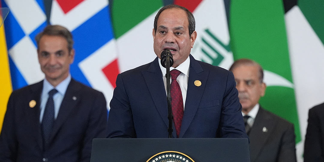 Egypt's President Abdel Fattah al-Sisi delivers a statement during a summit on Gaza in Sharm el-Sheikh on October 13, 2025. Trump landed in Egypt on October 13 for a summit on Gaza, following a lightning visit to Israel after a ceasefire he brokered entered into force.
