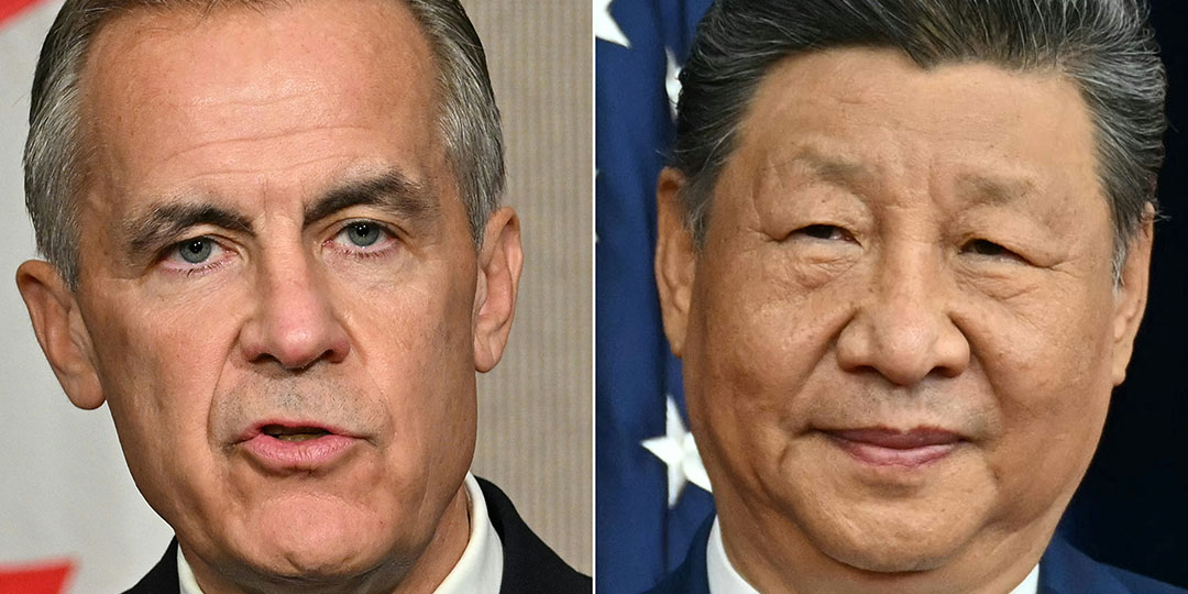 This combination of file pictures created on October 31, 2025 shows (L) Canada's Prime Minister Mark Carney speaking during a press conference on the sidelines of the 47th Association of Southeast Asian Nations (ASEAN) Summit in Kuala Lumpur on October 27, 2025, and (R) China's President Xi Jinping taking part in a meeting at Gimhae Air Base in Busan on October 30, 2025. Prime Minister Mark Carney on January 6, 2026 will begin a state visit to China, the first in eight years for a Canadian leader, with aims to talk trade and rebuild ties after years of diplomatic tensions.