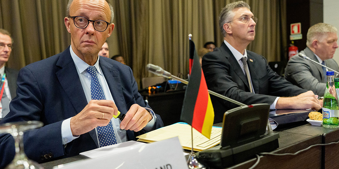 Germany's Chancellor Friedrich Merz (L) sits next to Croatia's Prime Minister Andrej Plenkovic (C) and Slovakia's Prime Minister Robert Fico (R) during a EU meeting at the European Union (EU) - African Union (AU) summit in Luanda, Angola, on November 24, 2025. European and African leaders gather in Angola for a summit to deepen economic and security ties, with emergency talks on Ukraine also on the cards.