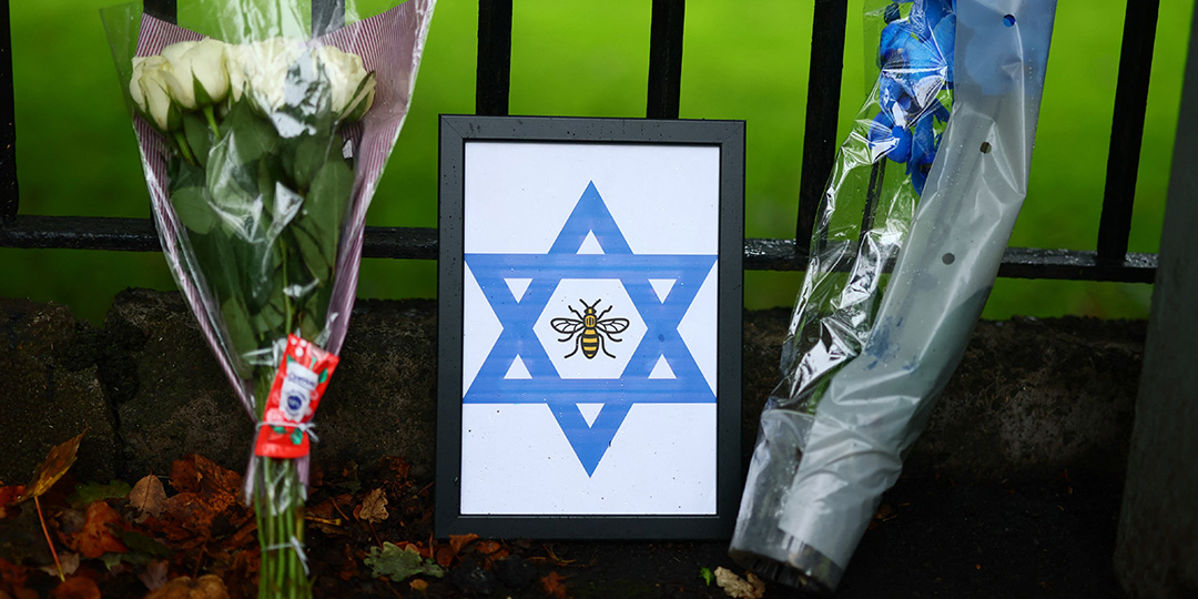 Flowers and a tribute feature a bee, and a Star of David, are pictured near Heaton Park Hebrew Congregation synagogue in Crumpsall, north Manchester, on October 3, 2025, following an attack at the synagogue yesterday. An attacker, named as Jihad al-Shamie, ploughed a car into a crowd outside a packed synagogue in Britain on Thursday, a Jewish holiday, before going on a stabbing spree, killing two people and leaving three wounded, police said. (Photo by Paul Currie / AFP)