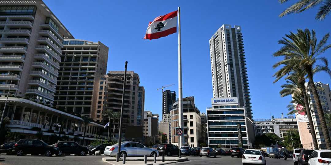 People drive past a Lebanese national flag fluttering in a square in central Beirut on October 21, 2024, amid the ongoing Israel-Hezbollah war. The United States said on October 21 it wants the Israel-Hezbollah war to end "as soon as possible", as it pressed for the enforcement of a UN resolution that required the armed group to withdraw from south Lebanon. (Photo by Joseph EID / AFP)