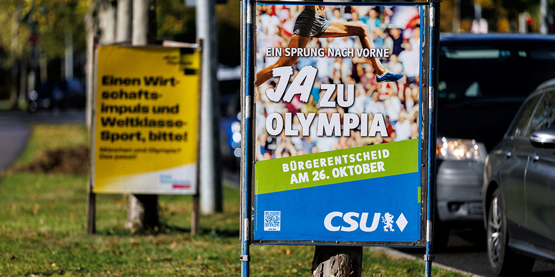 A photo taken on October 24, 2025 shows a placard with the lettering 'A jump ahead - Yes to the Olympics' in Munich, southern Germany, ahead of a citizens' decision on the bid of the city of Munich to organize the Olympic Summer Games from 2036. A strong majority in the German city of Munich voted in favour of a bid to host the Summer Olympics in 2036, 2040 or 2044 in a referendum on October 26, 2025. Early results showed around 62 percent of voters in the Bavarian capital voted in favour. "Munich clearly voted yes," city mayor Dieter Reiter said in a statement.