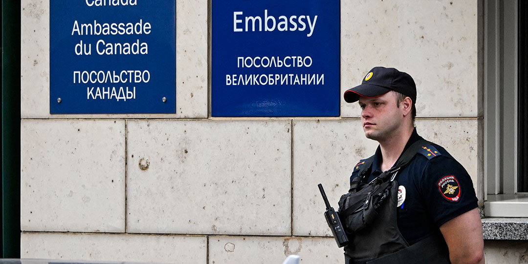 A Russian police officer patrols outside the British embassy building in Moscow on September 13, 2024. Russia's FSB security service on September 13, 2024 announced that the accreditation of six British diplomats had been withdrawn for suspected espionage and for "threatening Russia's security". "As a measure of reprisals to the multiple unfriendly acts of London, the Russian foreign ministry ... has withdrawn the accreditation of six employees from the political department of the British embassy in Moscow," it said in a statement, accusing them of carrying out "subversive activities and intelligence" gathering. (Photo by Alexander NEMENOV / AFP)