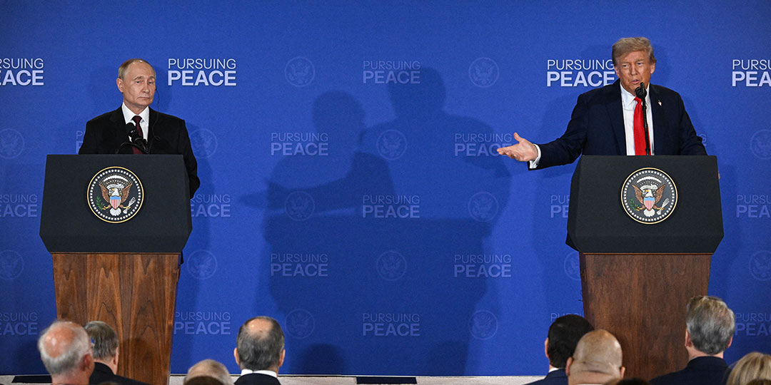 US President Donald Trump (R) gestures toward Russian President Vladimir Putin as they deliver a joint press conference after participating in a US-Russia summit on Ukraine at Joint Base Elmendorf-Richardson in Anchorage, Alaska, on August 15, 2025. (Photo by Drew ANGERER / AFP)