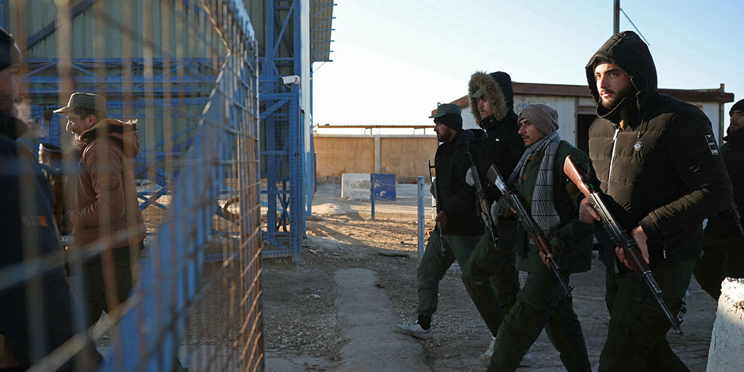 Members of Syrian security forces march through the entrance of the Al-Hol camp in the desert region of Hasakeh province on January 21, 2026. Syria's army on January 21 entered the country's vast Al-Hol detention camp that houses relatives of suspected Islamic State jihadists, from which Kurdish forces withdrew the day before, according to an AFP journalist at the scene.