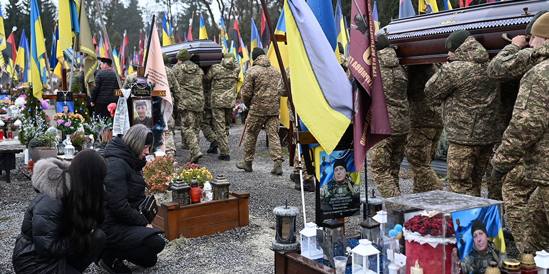 Mourners knee as Ukrainian soldiers carry the coffins of Ukrainian servicemen Marian Maksymiv and Andriy Dobryansky during a funeral ceremony at the Lychakiv military cemetery in Lviv on December 2, 2025, amid the Russian invasion of Ukraine. (Photo by Sergei GAPON / AFP)