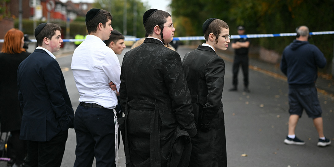 Members of the local community stand by a police cordon near to Heaton Park Hebrew Congregation synagogue in Crumpsall, north Manchester, on October 2, 2025, following an attack at the synagogue. Two people were killed and three wounded in a car ramming and stabbing incident outside a synagogue in Manchester, northwest England, on Thursday, police said. "A man believed to be the offender was shot by GMP (Greater Manchester Police) Firearms Officers and is also believed to be deceased," the force said on X, adding his death could not yet be confirmed due to "suspicious items on his person". (Photo by Oli SCARFF / AFP)