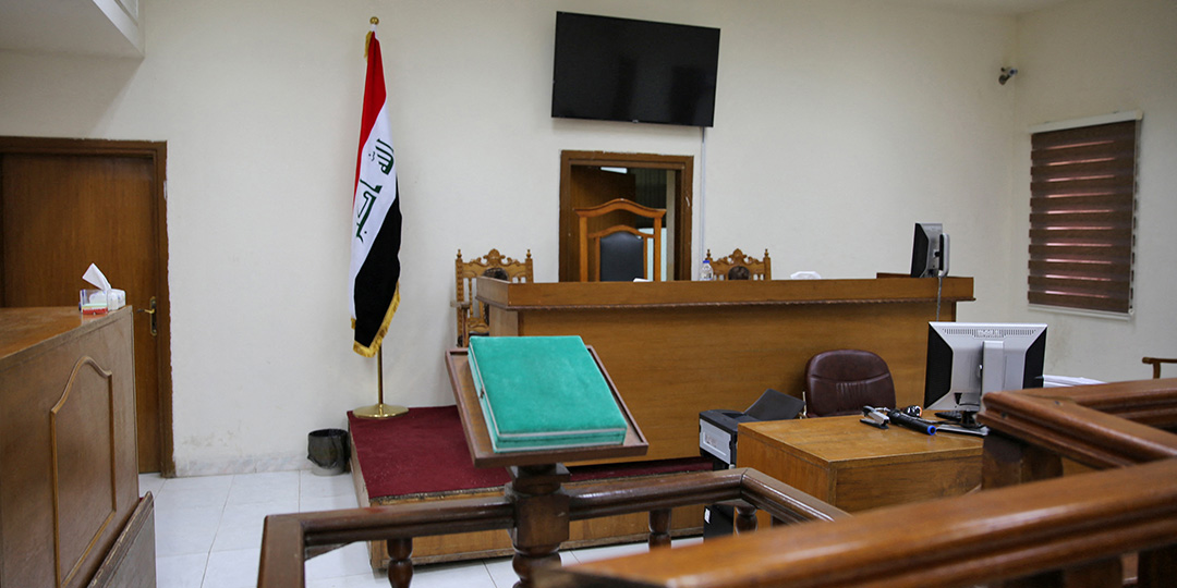 A picture shows a courtroom at Baghdad's Karkh main appeals court building in the western sector of the Iraqi capital on May 29, 2019 where French jihadists accused of belonging to the Islamic state are being tried. The Baghdad court sentenced a Frenchman to death for joining the Islamic State group, bringing to seven the number of French jihadists on death row in Iraq. (Photo by SABAH ARAR / AFP)