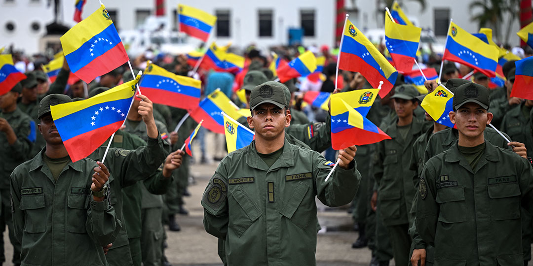 Members of the Bolivarian National Armed Force (FANB) wave the Venezuelan flag during a military ceremony at Fuerte Tiuna, in Caracas on November 25, 2025. (Photo by Federico PARRA / AFP)