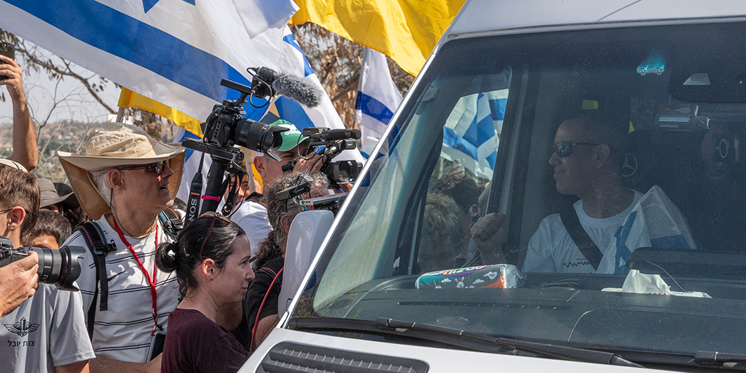 Former Israeli-Hungarian hostage Omri Miran (R) speaks with journalists upon his arrival at his family's temporary home in Kramim kibbutz, in southern Israel, on October 17, 2025. Miran was taken from his home in Nahal Oz kibbutz by Palestinian militants during the 2023 October 7 attacks on Israel. He was among twenty living Israeli hostages released on October 13, 2025, after more than two years in captivity in Gaza, as part of a ceasefire deal with Hamas.