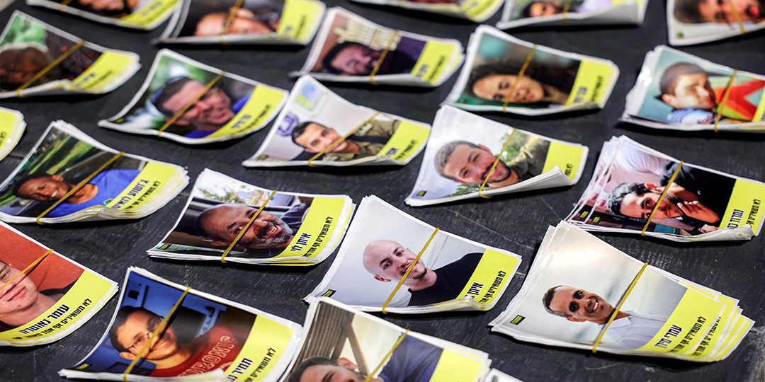 Pictures of Israeli hostages are displayed during an anti-government protest organised by the families of the Israeli hostages taken captive in the Gaza Strip since the October 2023, marking 722 days of the ongoing war between Israel and Palestinian militant movement Hamas, calling for a ceasefire and for action to secure the hostages' release, outside the Tel Aviv Museum of Art (known as the "Hostages' Square") in Tel Aviv on September 27, 2025. Of the 251 hostages seized during Hamas's October 2023 attack that sparked the war, Palestinian militants still hold 47 in Gaza, including 25 the Israeli military says are dead. (Photo by Jack GUEZ / AFP)