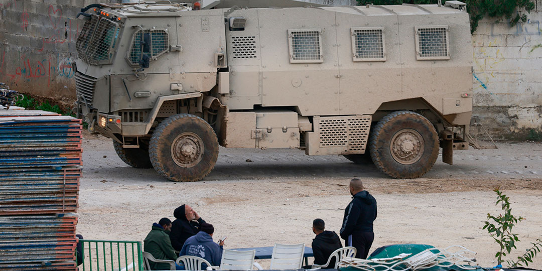 An Israeli military vehicle drives along a road near the Nur Shams Palestinian refugee camp (unseen), which was evacuated in early 2025 during an ongoing Israeli military operation, in the Israeli-occupied West Bank on January 12, 2026. In early 2025, the Israeli military launched an operation it said was aimed at dismantling Palestinian armed groups from camps in northern West Bank -- including Nur Shams, Tulkarem and Jenin. Many residents believe Israel is seeking to destroy the idea of the camps themselves, turning them into regular neighbourhoods of the cities they flank, in order to eliminate the refugee issue.