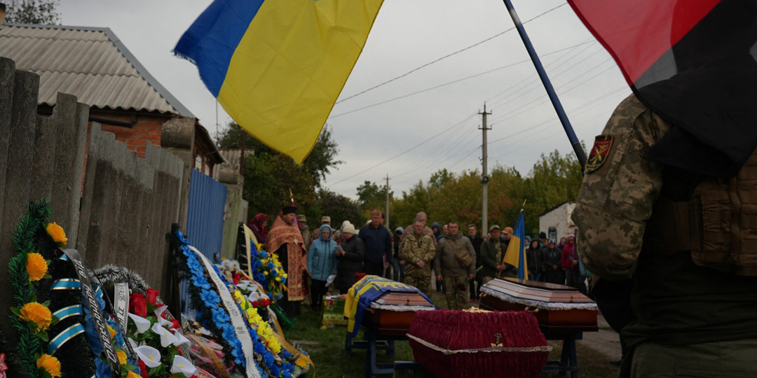 Relatives and friends mourn over coffins during a funeral ceremony for 26-year-old Alona and 35-year-old Oleksandr Lesnichenko and their children Denys and Yegor killed following a Russian drone strike in the Sumy oblast in Chernechchyna, on October 1, 2025, amid the Russian invasion of Ukraine. Russian drone strike crashed on a village in Ukraine overnight, killing two small boys and their parents, including the mother who was pregnant with twins, Ukrainian authorities said. (Photo by Yevhen Abrasimov / AFP)