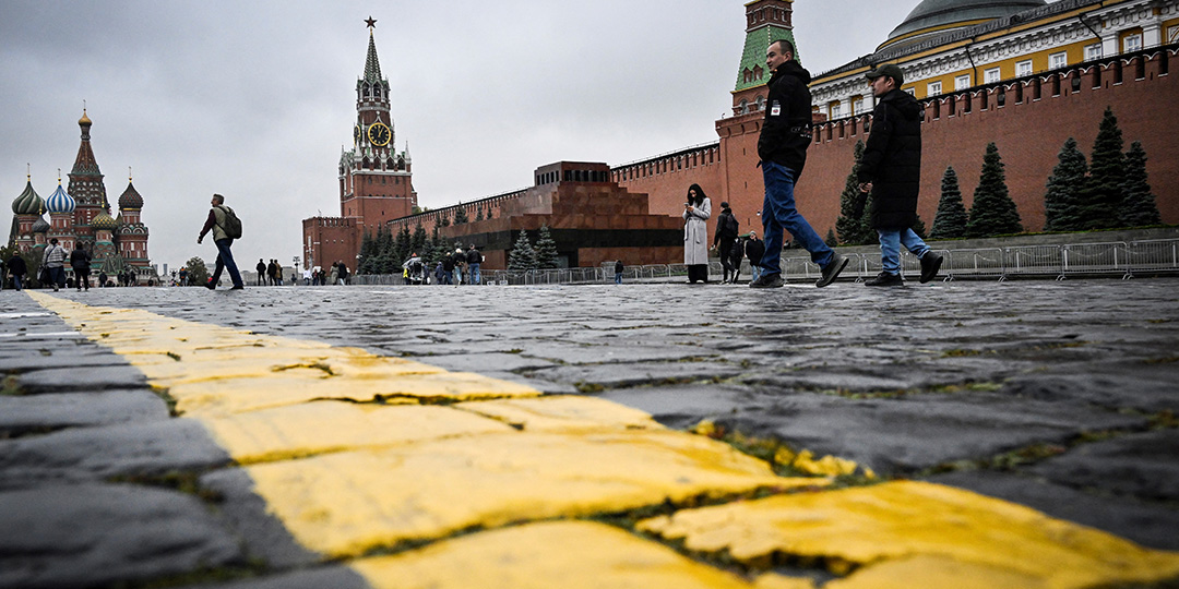 People walk along Red Square, with St. Basil's Cathedral (L) and the Kremlin's Spasskaya Tower (C) seen in the background, in downtown Moscow on October 6, 2025. Ukraine has found tens of thousands of foreign-made parts in the drones and missiles Russia fired in a weekend air attack on the country, President Volodymyr Zelensky said Monday. (Photo by Alexander NEMENOV / AFP)