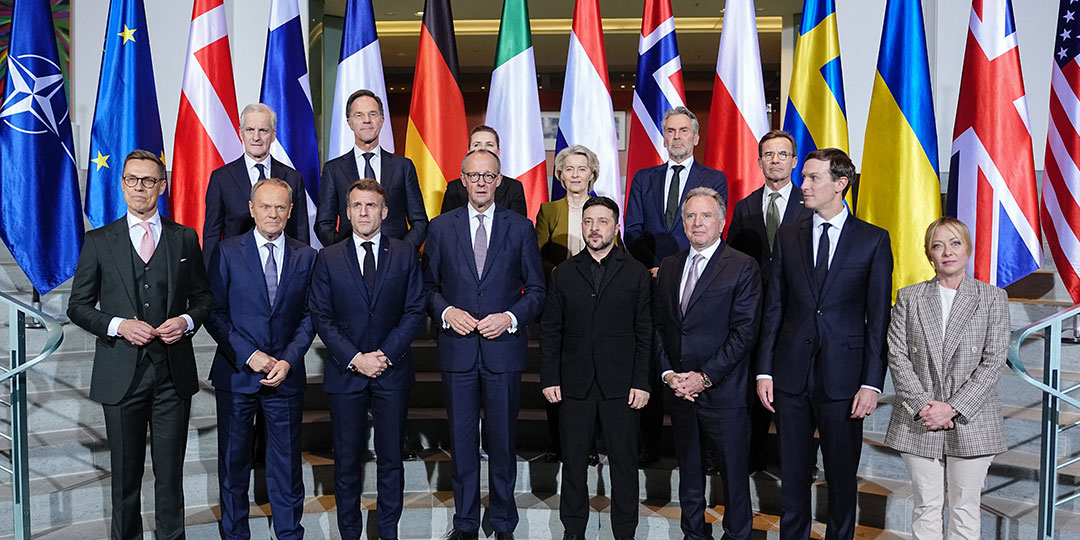 TOPSHOT - (Front row L-R) Finland's President Alexander Stubb, Poland's Prime Minister Donald Tusk, French President Emmanuel Macron, German Chancellor Friedrich Merz, Ukraine's President Volodymyr Zelensky, US special envoy Steve Witkoff, the US President's son-in-law Jared Kushner and Italy's Prime Minister Giorgia Meloni, an (back row L-R) Norway's Prime Minister Jonas Gahr Store, NATO Secretary General Mark Rutte, Denmark's Prime Minister Mette Frederiksen, European Commission President Ursula von der Leyen, Netherland's Prime Minister Dick Schoof and Sweden's Prime Minister Ulf Kristersson pose for a family photo on December 15, 2025 at the Chancellery in Berlin, where they meet for talks on how to end the grinding war of Russia with Ukraine. (Photo by Kay Nietfeld / POOL / AFP)