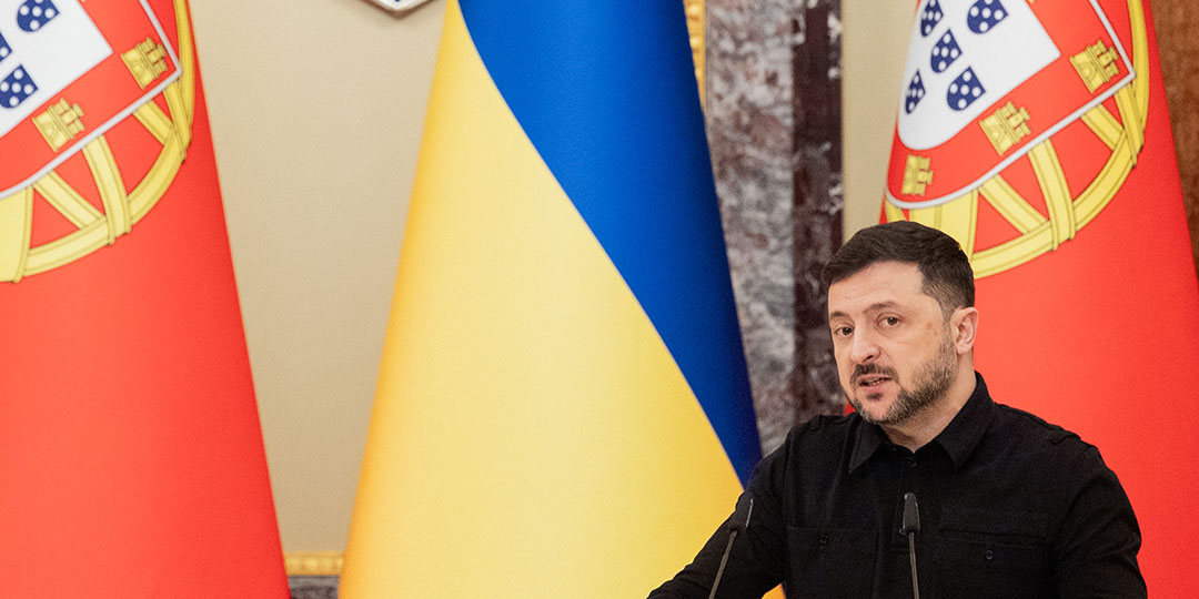 Ukraine's President Volodymyr Zelensky speaks during a joint press conference with Portugal's Prime Minister Luis Montenegro (unseen) in Kyiv on December 20, 2025, amid the Russian invasion of Ukraine. (Photo by Tetiana DZHAFAROVA / AFP)