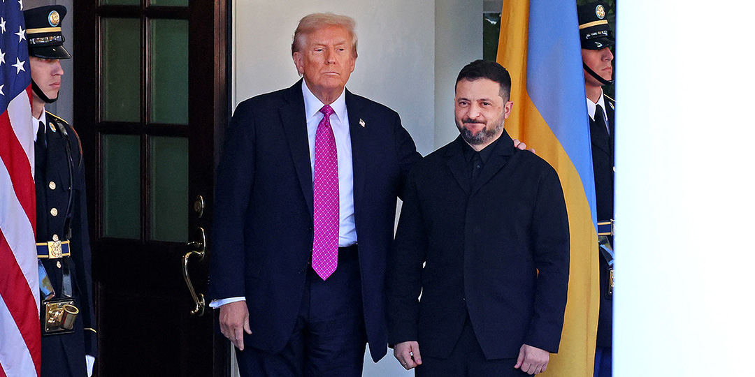 US President Donald Trump welcomes Ukrainian President Volodymyr Zelensky as he arrives for a meeting at the White House in Washington, DC, on October 17, 2025. (Photo by TOM BRENNER / AFP)