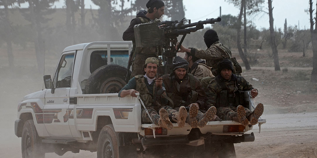 Opposition fighters sit in the back of an armed pick-up truck as they drive in the village of Bizaah, north of Aleppo, during ongoing clashes with Islamic State (IS) group jihadists on February 6, 2017. (Photo by Nazeer al-Khatib / AFP)