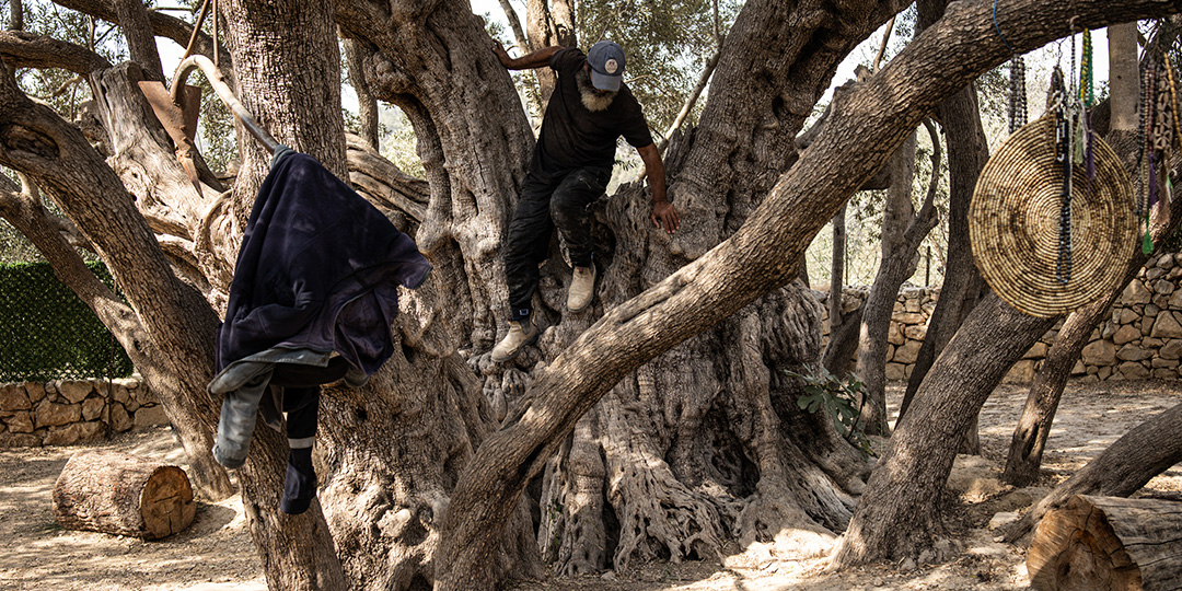 Salah Abu Ali, 52, official guardian of Palestinians alleged oldest olive tree, between 3000 and 5000 years old, climbs down from it in Al-Walajah, occupied West Bank on November 4, 2025. More than half of Al-Walajah's original land now lies on the far side of the Israeli security wall. Yet so far the village has been spared the settler assaults that have marred this year's olive harvest, leaving many Palestinians injured.