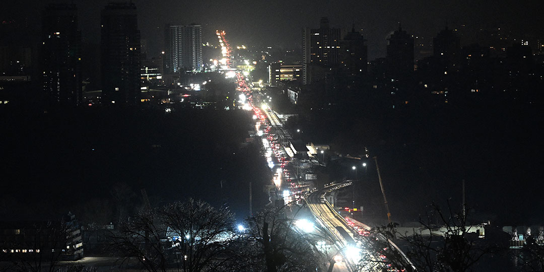 Cars drive along a road during a power outage in Kyiv on January 20, 2026, amid the Russian invasion of Ukraine. An overnight Russian bombardment left thousands of residential buildings in Kyiv without heating and water in -14C temperatures on January 20, 2026, when the Ukrainian capital was already scrambling to restore vital utilities destroyed in earlier attacks.