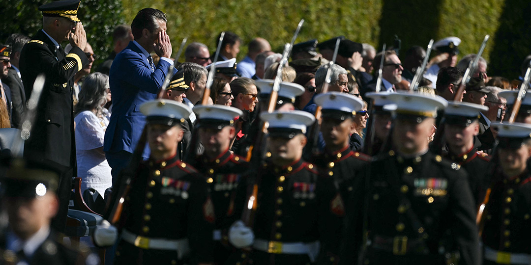 US Secretary of Defense Pete Hegseth and US Army Chief of Staff General Randy George (L) salute the troops during the 2025 National POW/MIA Recognition Day ceremony at the Pentagon in Washington, DC on September 19, 2025. (Photo by Jim WATSON / AFP)