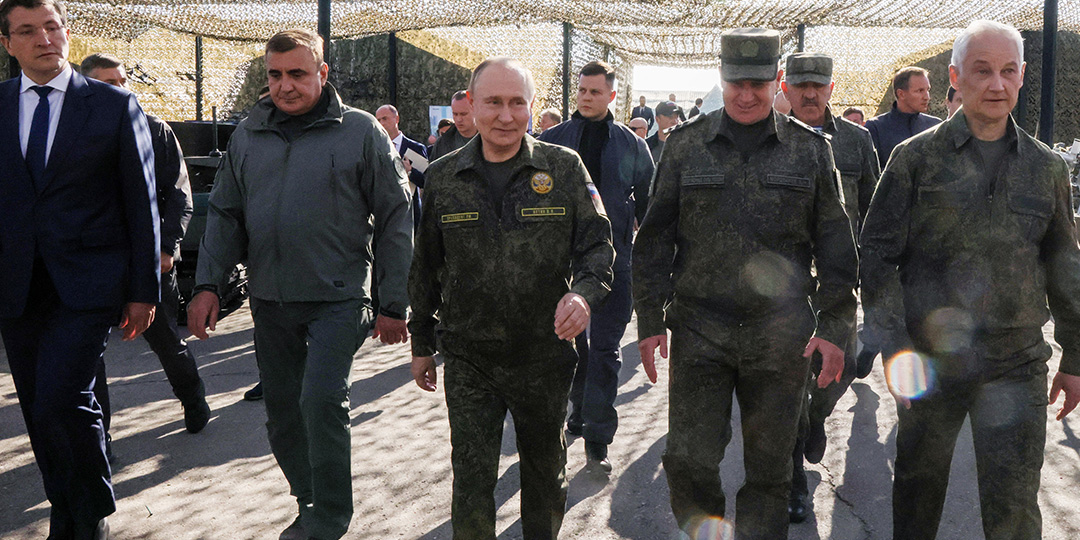 In this pool photograph distributed by the Russian state agency Sputnik, Russia's President Vladimir Putin tours an exhibition of military equipment while inspecting the "Zapad-2025" (West-2025) joint Russian-Belarusian military drills at a training ground in the Nizhny Novgorod Oblast on September 16, 2025. (Photo by Mikhail METZEL / POOL / AFP)