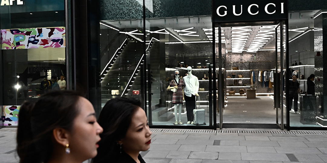 People walk past a Gucci store in Beijing on April 20, 2025. (Photo by Pedro PARDO / AFP)