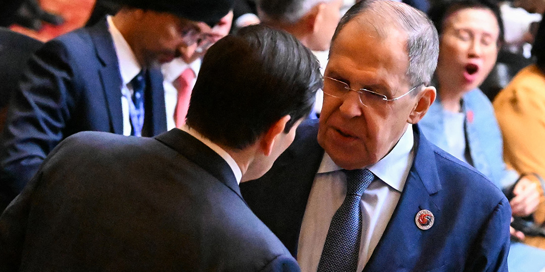 US Secretary of State Marco Rubio (L) talks to Russia's Foreign Minister Sergei Lavrov at the 15th East Asia Summit Foreign Ministers’ meeting during the 58th Association of Southeast Asian Nations (ASEAN) Foreign Ministers’ meeting and related meetings at the Convention Centre in Kuala Lumpur on July 11, 2025. (Photo by MOHD RASFAN / AFP)