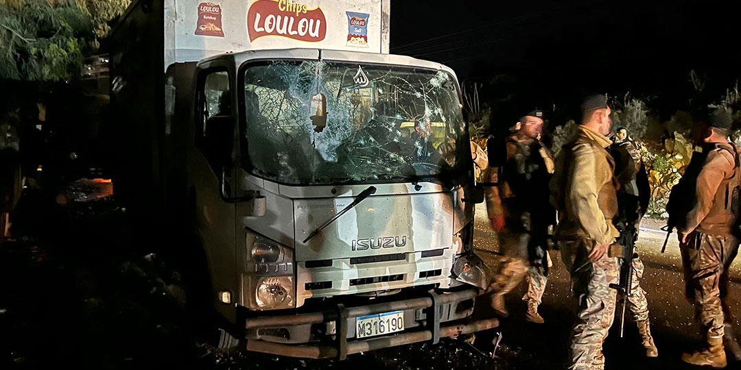 / Lebanese soldiers secure the site of an Israeli drone strike that targeted a truck in the village of Sibline, south of Beirut, on December 16, 2025. Despite a November 2024 ceasefire that was supposed to end more than a year of hostilities between Israel and Hezbollah, Israel has kept up strikes on Lebanon and has also maintained troops in five southern areas it deems strategic.