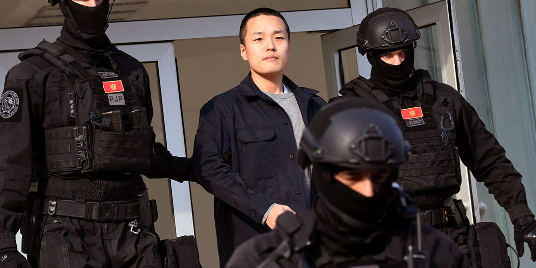 Montenegrin police officers of the PJP (Special Police Unit) escort South Korean cryptocurrency entrepreneur Do Kwon (C) at the exit of a court in Podgorica, Montenegro, on March 23, 2024. South Korean cryptocurrency tycoon Do Kwon was sentenced to 15 years in prison on December 11, 2025 over a fraud linked to his company's failure, which wiped out about $40 billion of investors' money and shook global crypto markets, US media reported.