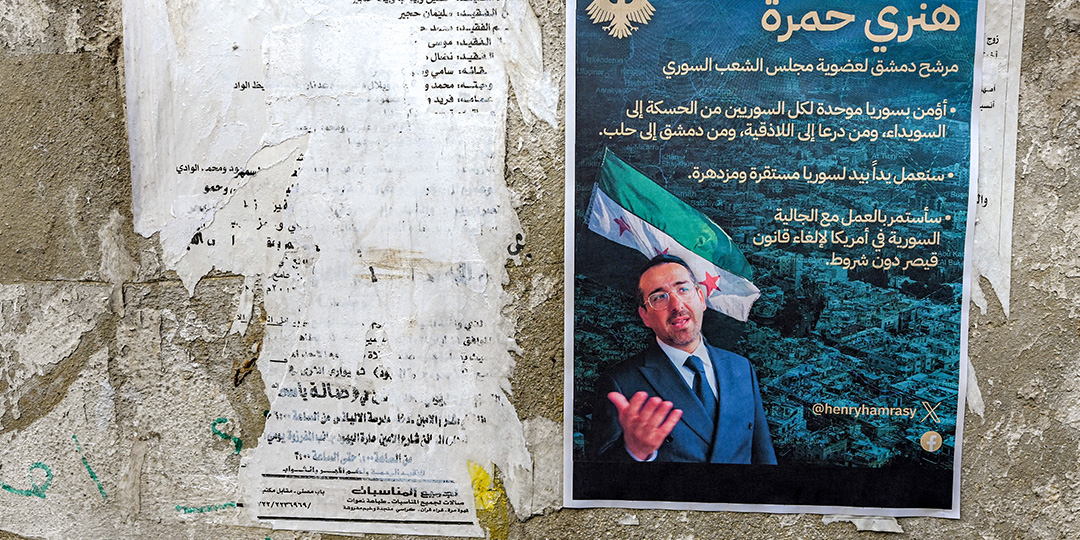 في حارة اليهود في دمشق، شاهد مصورو فرانس برس الجمعة، منشورات لحملة حمرة الانتخابية ملصقة على جدران عدد من الأبنية، ضمت صورته وخلفه العلم السوري مرفقا بتعليق “مرشح دمشق لعضوية مجلس الشعب السوري”.