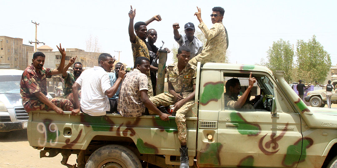 Sudanese army soldiers celebrate as they patrol in Salha, south of Omdurman, two days after the Sudanese army recaptured it from the paramilitary Rapid Support Forces (RSF), on May 22, 2025. The Sudanese army said on May 20 that it had dislodged rival paramilitaries from their last positions in Omdurman, part of the Sudanese capital, securing all of Khartoum state nearly two months after recapturing the capital's centre. (Photo by Ebrahim Hamid / AFP)