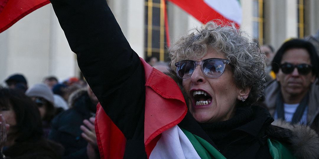 A protester chants during a demonstration against the Iranian regime's crackdown on protests, in central Paris, on January 4, 2026. Several hundred people gathered on January 4, 2026 at two rallies in Paris in support of the week-long protest movement in Iran.