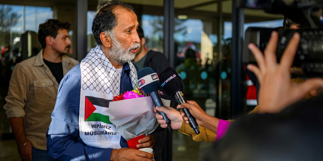 Sami Abulaziz Hasan Ebrahim of Bahrain, one of the activists who were sailing aboard vessels from the Global Sumud Flotilla, speaks to the press after arriving with thirty-six Turks and nationals from 12 countries at Istanbul Airport on a special flight, after Israel stopped a Gaza-bound aid flotilla and detained hundreds of people, in Istanbul on October 4, 2025. "We expect 36 of our nationals on the Global Sumud Flotilla vessels seized by Israeli forces in international waters will return to our country this afternoon via a special flight," Turkish foreign ministry spokesman Oncu Keceli said on X, adding that the number has not been finalised. The Turkish diplomatic source said nationals from the United States, United Arab Emirates, Algeria, Morocco, Italy, Kuwait, Libya, Malaysia, Mauritania, Switzerland, Tunisia, and Jordan planned to be on the Turkish Airlines flight. (Photo by Yasin AKGUL / AFP)