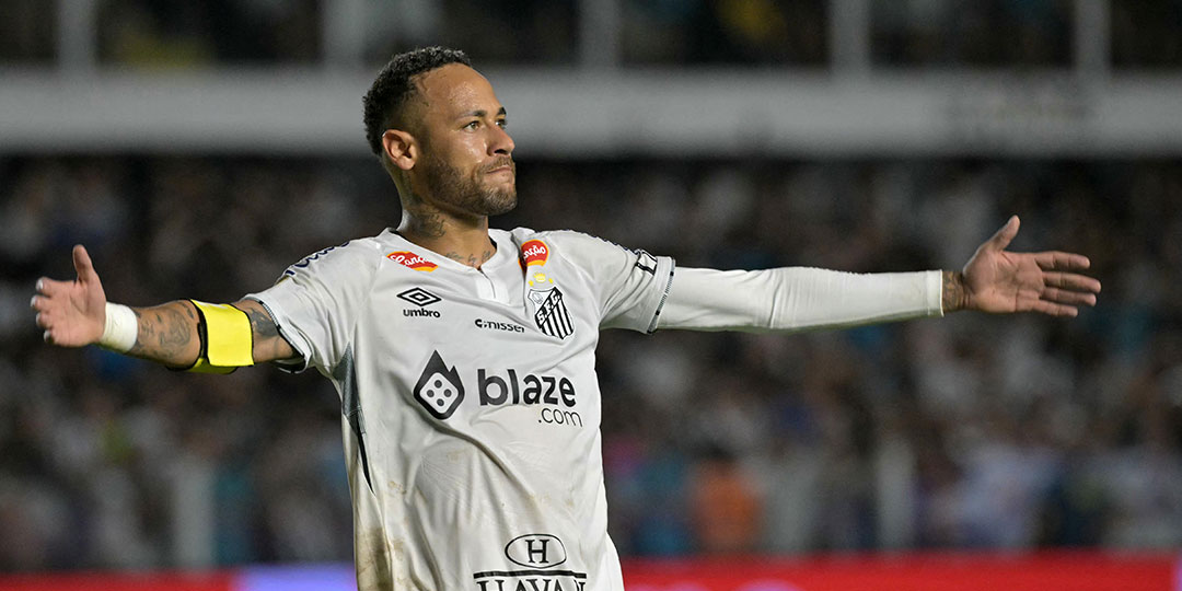 Santos' forward Neymar #10 gestures during the Campeonato Paulista football match between Santos and Botafogo de Ribeirao Preto at the Urbano Caldeira Stadium in Santos, Sao Paulo state, Brazil on February 5, 2025. Neymar has undergone a successful operation on his left knee to repair a damaged meniscus, his club Santos said on December 22, 2025.