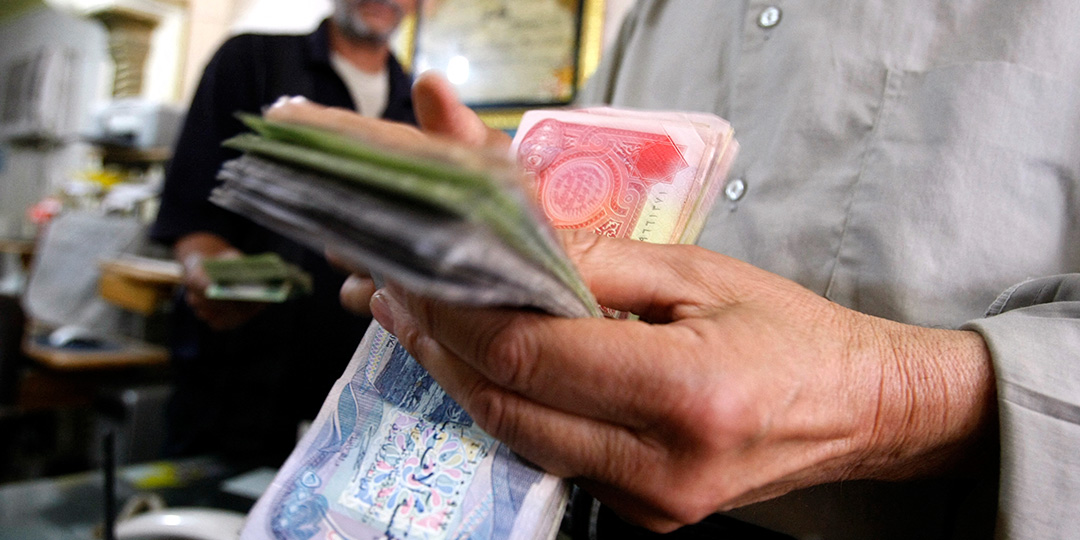 An Iraqi man counts out Iraqi Dinars at a money changer in central Baghdad, on May 25, 2009. The Iraqi Central Bank warned against using the country's reserves to finance government projects. AFP PHOTO / SABAH ARAR (Photo by SABAH ARAR / AFP)
