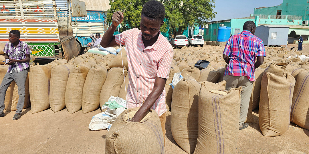 Sudanese farmers inspect sesame crops from sacks during the current harvest season at the Gedaref crop market, the largest crop market in the country, in eastern Sudan on November 12, 2025. Two UN food agencies warned November 11 that millions more people around the globe could face famine, with funding shortfalls worsening already dire conditions. The joint report from the Food and Agriculture Organization and the World Food Programme said conflict and violence were driving acute food insecurity in the majority of the countries identified at risk.