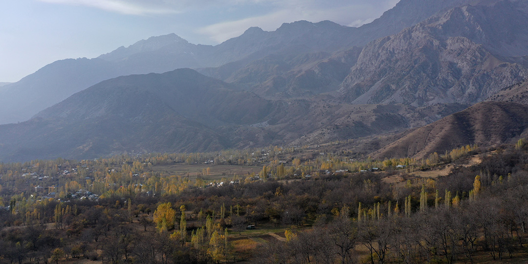 An aerial view shows a walnut tree nursery in walnut forests in Arslanbap in Kyrgyzstan's Jalal-Abad region on October 22, 2025. Rustling through fallen golden leaves, locals in a forest outside Arslanbap in the Kyrgyz mountains were scurrying for walnuts -- an ancient pastime and economic lifeline for many in the region. But the forest, the world's largest wile walnut grove, has for years been slowly fading -- hit by the overgrazing of livestock, illegal logging and rising temperatures.