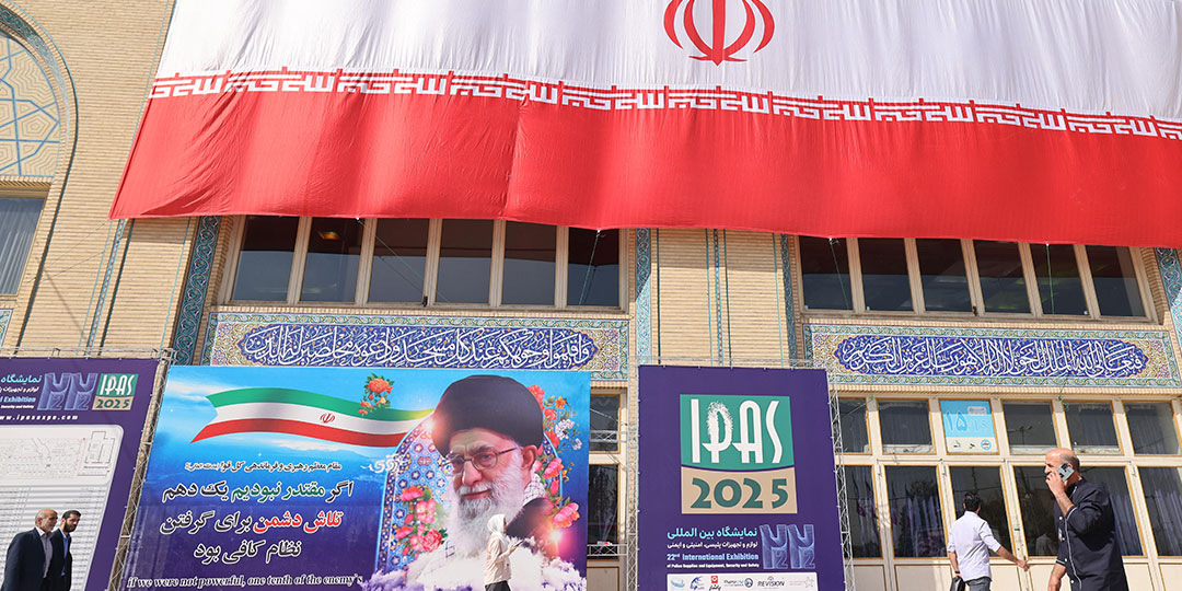 Iranians walk past a poster featuring Iran’s Supreme Leader Ayatollah Ali Khamenei outside the venue of the 22nd Police and Security Equipment Exhibition at Imam Khomeini Mosque in Tehran on October 15, 2025. (Photo by ATTA KENARE / AFP)