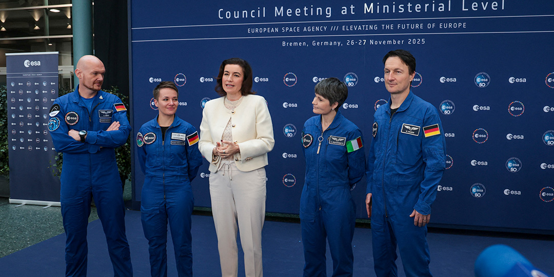 German Minister for Research, Technology and Aerospace Dorothee Baer (C) gives a press statement flanked with astronauts (From L) Alexander Gerst, Amelie Schoenenwald, Samantha Cristoforetti and Matthias Maurer during the European Space Agency (ESA) ministerial meeting at the Congress Centrum in Bremen, northern Germany, on November 26, 2025. Ministers from the 23 member states of the European Space Agency (ESA) meet in the Hanseatic city for two days to discuss the strategic direction of European spaceflight.