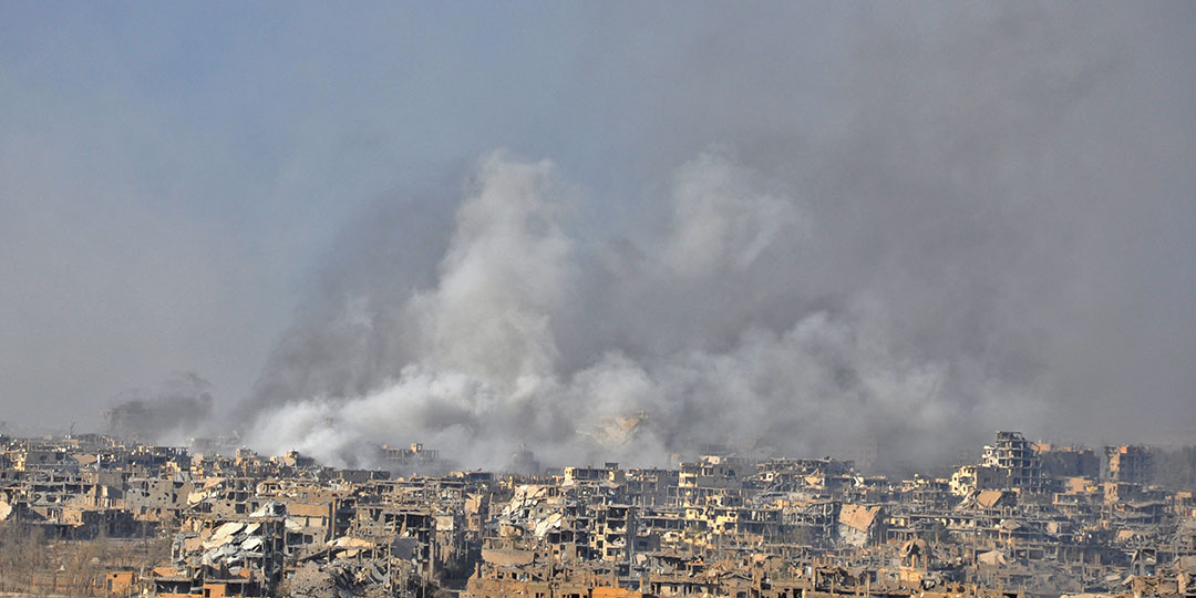 Smoke rises from buildings following an air strike by Syrian government forces in the eastern city of Deir Ezzor, on October 31, 2017, during an operation against Islamic State (IS) group jihadists. The Assad regime has been able to recapture more than half of Syria's territory with the support of Russian air strikes. It is now focusing on the oil-rich eastern province of Deir Ezzor, where the SDF alliance is also involved. (Photo by STRINGER / AFP)